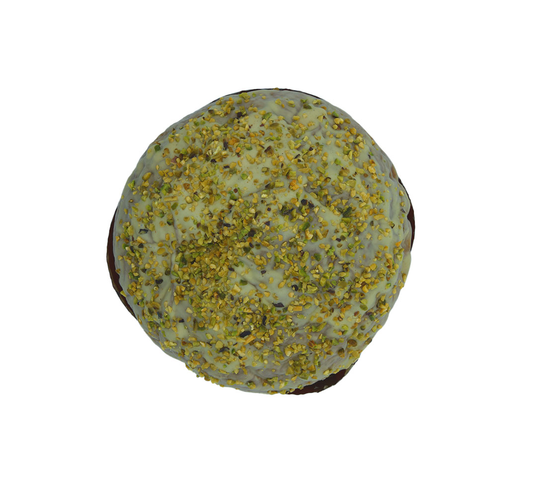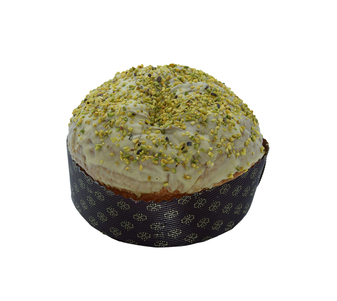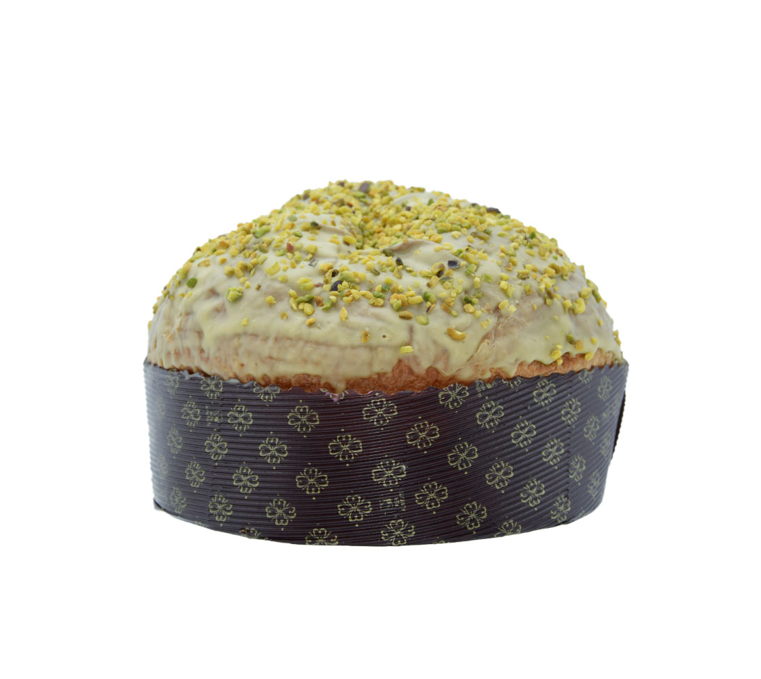 Ingredienti: Farina di FRUMENTO tipo”00″, pistacchio (zucchero, burro di cacao, pasta pistacchio, LATTE in polvere, lecitina di soia, aromi, colorante E471), BURRO di Normandia, glassa: pistacchio (pistacchio, sale, riboflaviana, E141) cioccolato bianco (zucchero, grasso vegetale, SIERO DI LATTE in polvere, LATTOSIO, amido di riso, olii vegetali, aroma), zucchero, acqua, TUORLO D’UOVO, lievito madre, miele,pasta d’arancia (glucosio, zucchero, succo di limone, aromi naturali) pasta di limone (glucosio, zucchero, succo di limone, aromi naturali) granella di pistacchio, sale, malto d’orzo, caviale di vaniglia del Madagascar